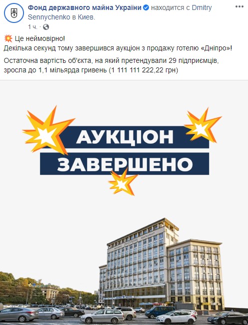 "Це неймовірно! Декілька секунд тому завершився аукціон з продажу готелю "Дніпро"! Остаточна вартість об'єкта, на який претендували 29 підприємців, зросла до 1,1 мільярда гривень (1 111 111 222,22 грн)", - йдеться в повідомленні.