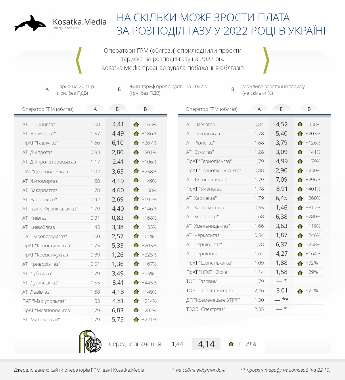 Також хочуть підвищити тариф на понад 400% Луганськгаз (з 1,55 грн до 8,41 грн) та Уманьгаз (з 1,78 грн до 8,91 грн).
