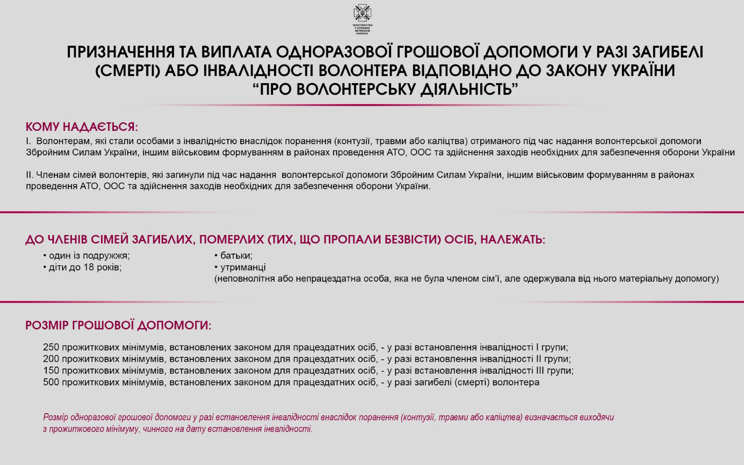Зазначається, що одноразова грошова допомога відтепер також призначатиметься та виплачуватиметься волонтерам, які надавали допомогу Збройним Силам України чи іншим силовим структурам під час заходів із забезпечення оборони України, безпеки населення та інтересів держави у зв'язку з військовою агресією РФ проти України і стали особами з інвалідністю внаслідок поранення (контузії, травми або каліцтва) під час надання такої допомоги, та членам сімей загиблих з числа таких волонтерів.
