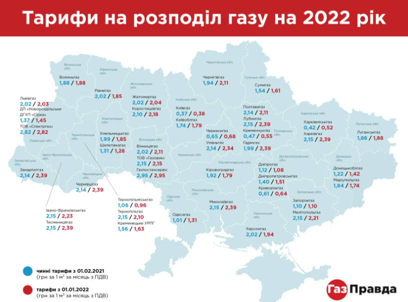 Найбільше зросли тарифи для ТОВ "Газпостачсервіс", що у Вінницькій області - 2,95 грн за кубометр, ТОВ "Спектргаз" - 2,82 грн за куб. м. Для "Гадячгазу", "Закарпатгазу", "Лубнигазу", "Миколаївгазу", "Тисменицягазу", "Харківгазу", "Чернівцігазу" тариф за доставку встановлено на рівні 2,39 грн за один куб. м.