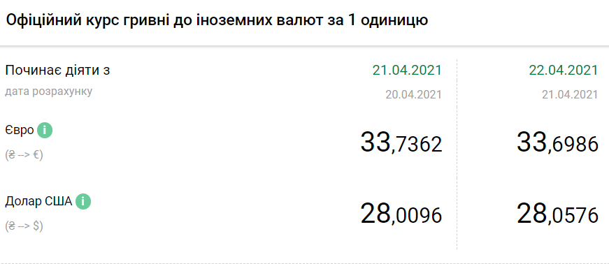 Згідно з офіційним курсом Національного банку України, 22 квітня курс гривні по відношенню до долара впав на 5 копійок. Таким чином, курс долара піднявся до максимуму з початку лютого.