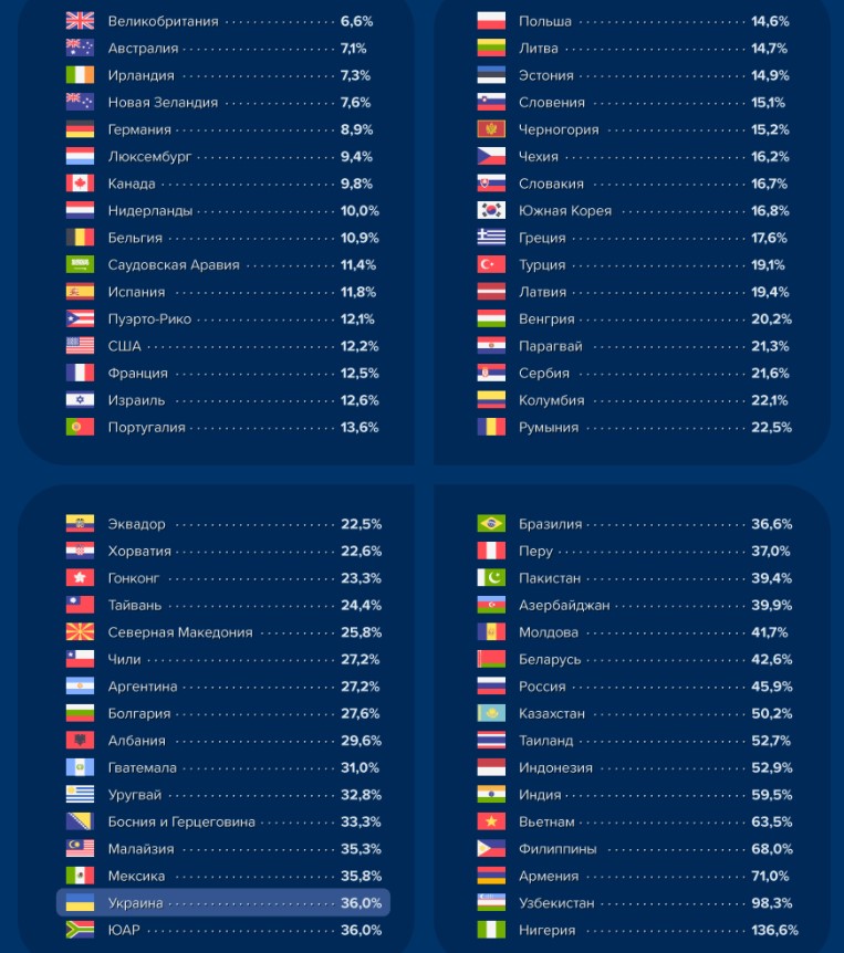 Примітно, що Україна - на 47-му місці з-поміж 64 країн у рейтингу витрат на мінімальний набір продуктів, зважаючи на суму зарплати на початок цього року. Лідирують у списку - Велика Британія, Ірландія та Австралія, де на продукти витрачають 6,6-7,3% від офіційного мінімального доходу. У Росії громадяни витрачають близько 50% на продукти, а в Польщі – 15%. На останньому рядку – Нігерія (136,6%).