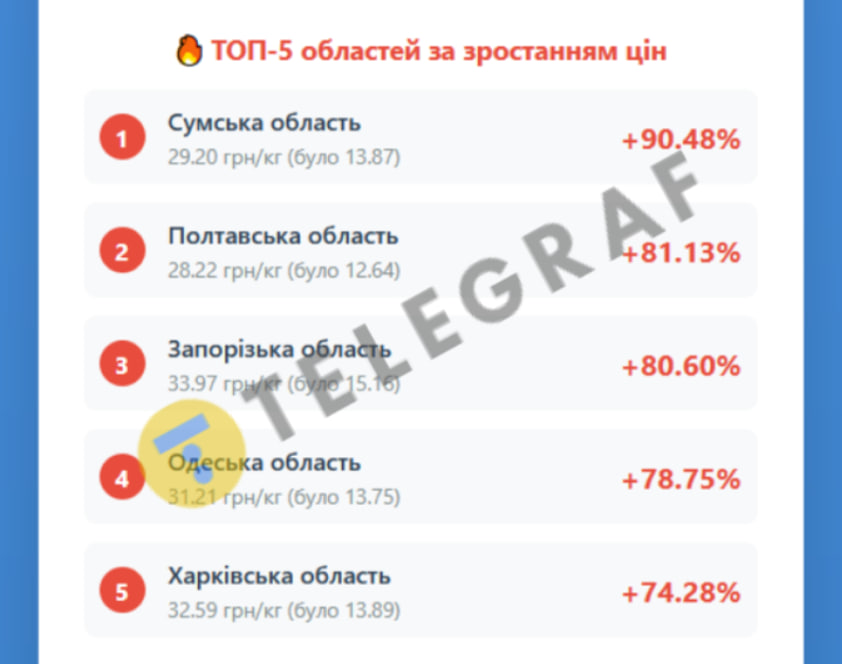 Найвищі ціни на цибулю зафіксували у Сумській області – там вона подорожчала на 90,48% і коштує 29,20 грн за кілограм. У Полтавській області зростання склало 81,13% при ціні 28,22 грн/кг. Запорізька область показала стрибок на 80,6% до 33,97 грн/кг.