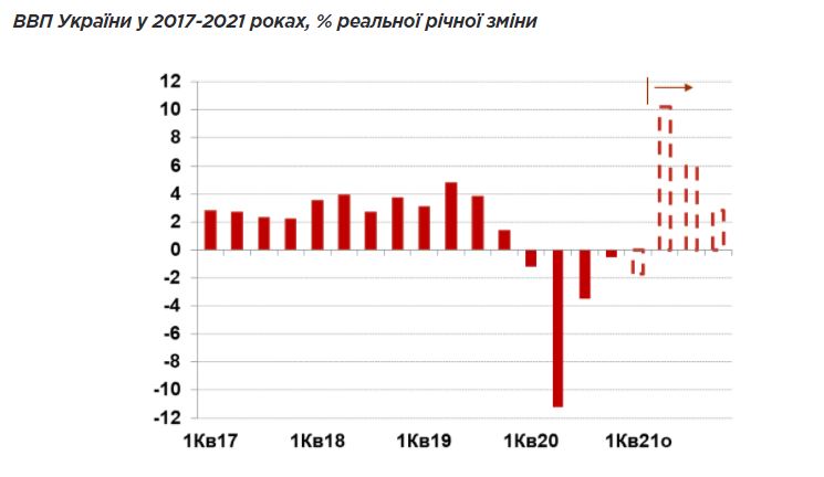 У другому півріччі 2021 відновлювальне зростання підживлюватиметься послабленням карантину та зростанням реальних доходів, а також збільшенням врожаю у агросекторі. Згідно з прогнозом, зростання реального ВВП України за підсумками 2021 становитиме 4,3%.