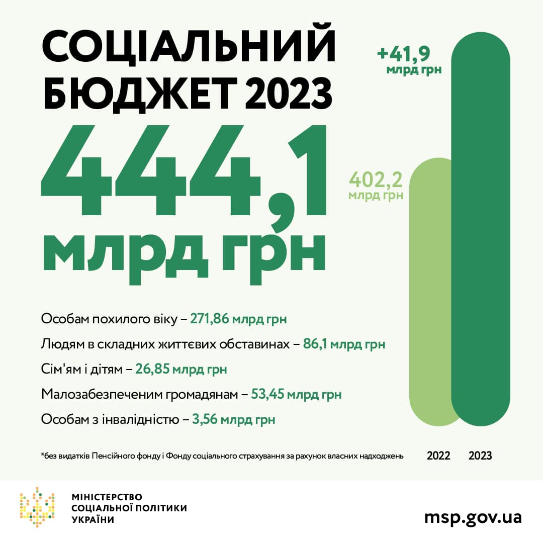 соціальну сферу в 2023 році українська влада планує витратити 444,13 млрд. грн., що на 41,9 млрд. грн. більше, ніж цього року.