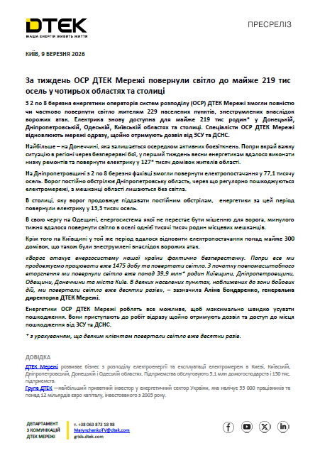 «З 2 по 8 березня енергетики ДТЕК змогли повністю чи частково повернути світло жителям 229 населених пунктів, знеструмлених внаслідок ворожих атак. Електрика знову доступна для майже 219 тис родин», - йдеться в ньому.