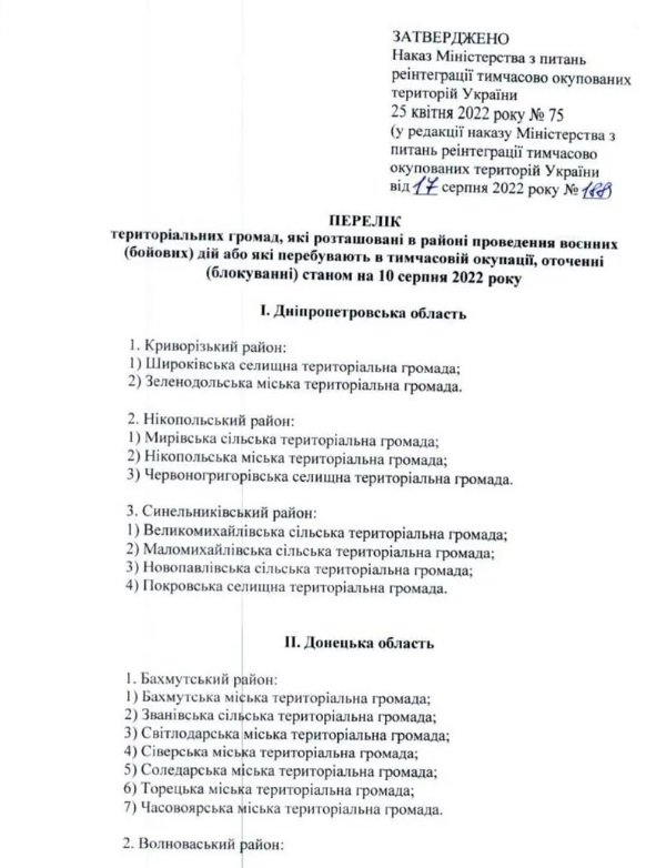 Водночас 13 громад отримали право на відповідні виплати. Йдеться про мешканців Мирівської сільської та Червоногригорівської селищної територіальних громад Нікопольського району Дніпропетровської області, до яких належать по сім населених пунктів.