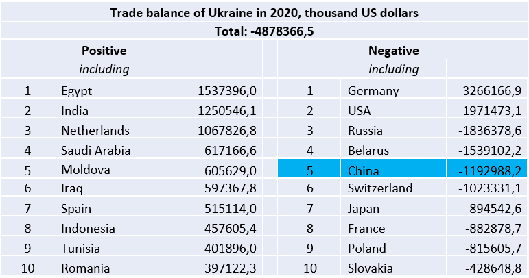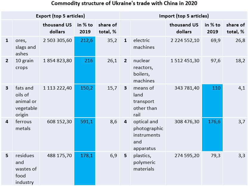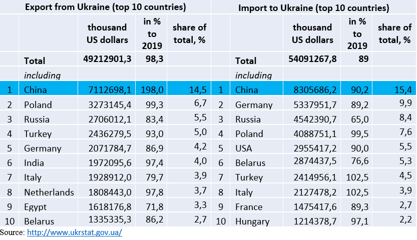 Currently, China is the first among the countries to which Ukraine exports and from where it imports goods. In particular, China"s share in Ukraine"s exports was equal to 14.5% and its share in Ukraine"s imports amounte to 15.4% in 2020.