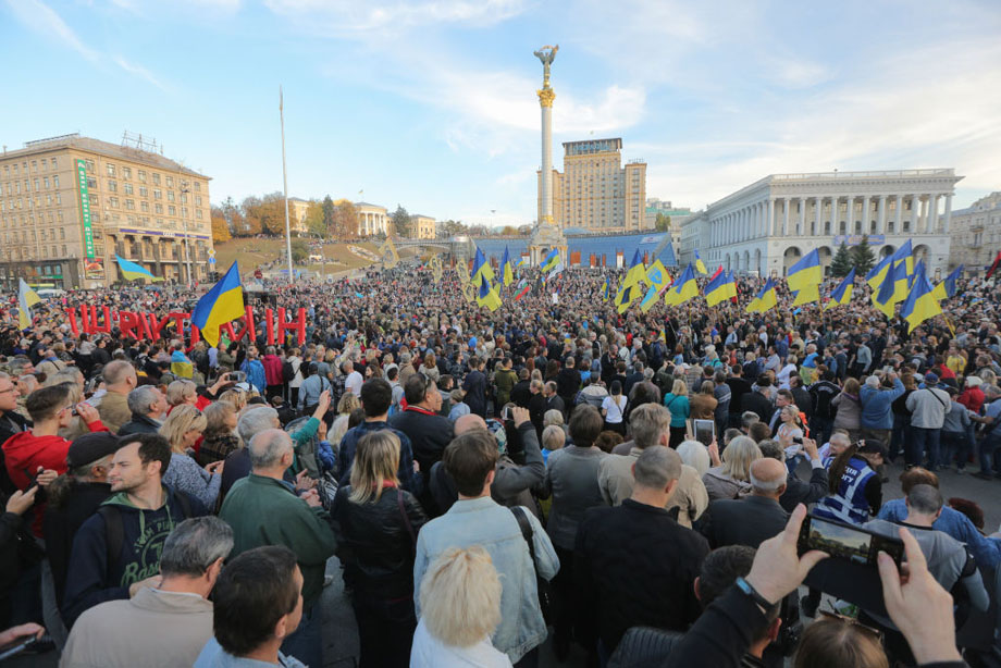 People attend a rally against surrender in Kyiv, Ukraine, October 14, 2019