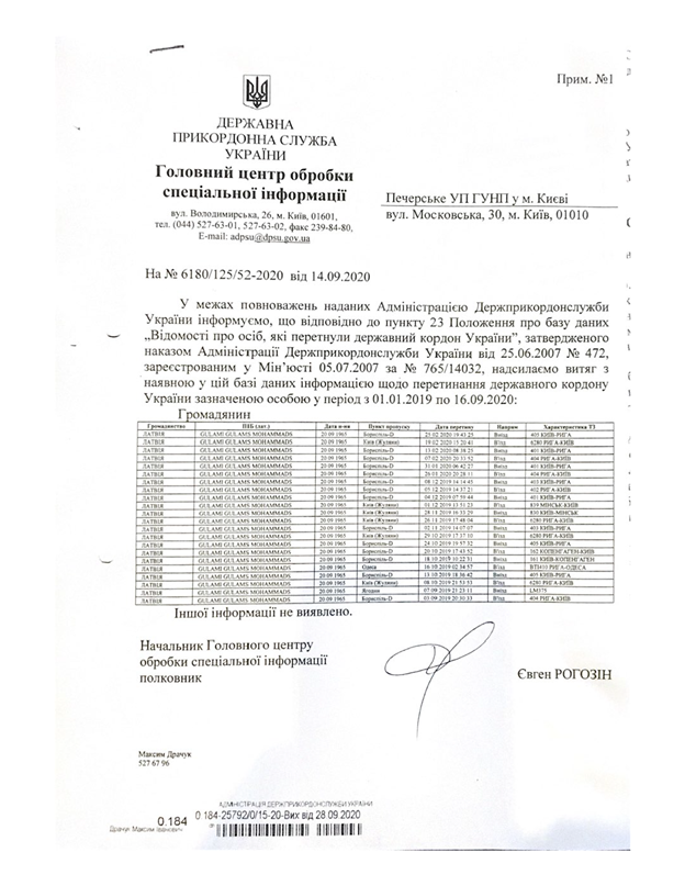 According to the court judgment, Gulami is not allowed to travel abroad. He cannot leave Latvia. However, during the trial, he visited Ukraine a number of times, including to physically and psychologically pressure me into changing my testimony. The court has my corresponding statement and official information from the Border Guard Service of Ukraine: only in the period of 2019-2020 Gulami crossed the Ukrainian state border 22 times in total. I"m curious how Latvia will react to this document...