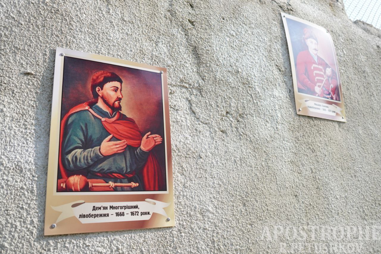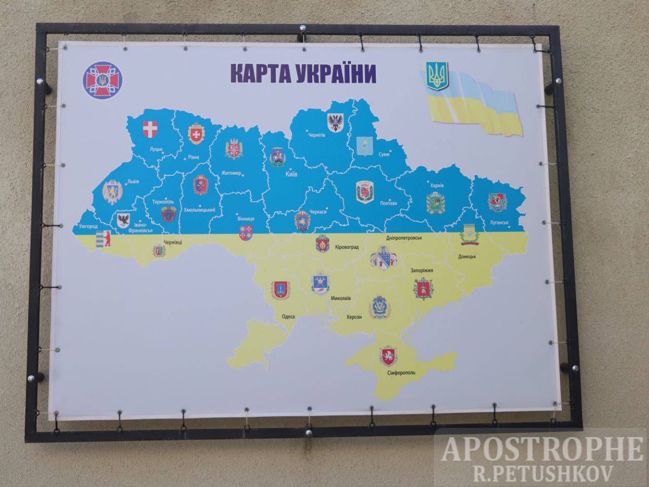 Beyond the perimeter, a building displays a map of Ukraine delineating 1991 borders, encompassing Crimea and presently occupied eastern and southern territories–an apt reminder. The adjoining corridor, serving assembly and meal routines for prisoners of war, is adorned with portraits of Ukrainian hetmans on one side and recent political figures like Stepan Bandera, Roman Shukhevych, and Yevhen Konovalets on the other.