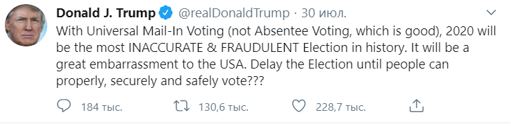 As Trump wrote in his Twitter account, "With Universal Mail-In Voting (not Absentee Voting, which is good), 2020 will be the most INACCURATE & FRAUDULENT Election in history. It will be a great embarrassment to the USA. Delay the Election until people can properly, securely and safely vote???"
