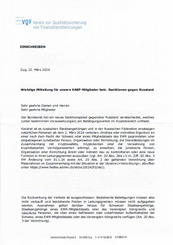 It is worth noting that the letter from the Swiss authorities concerns only crypto businesses, but the law provides for much broader prohibitions: Russians are prohibited from conducting any business related to the provision of financial services in Europe.
