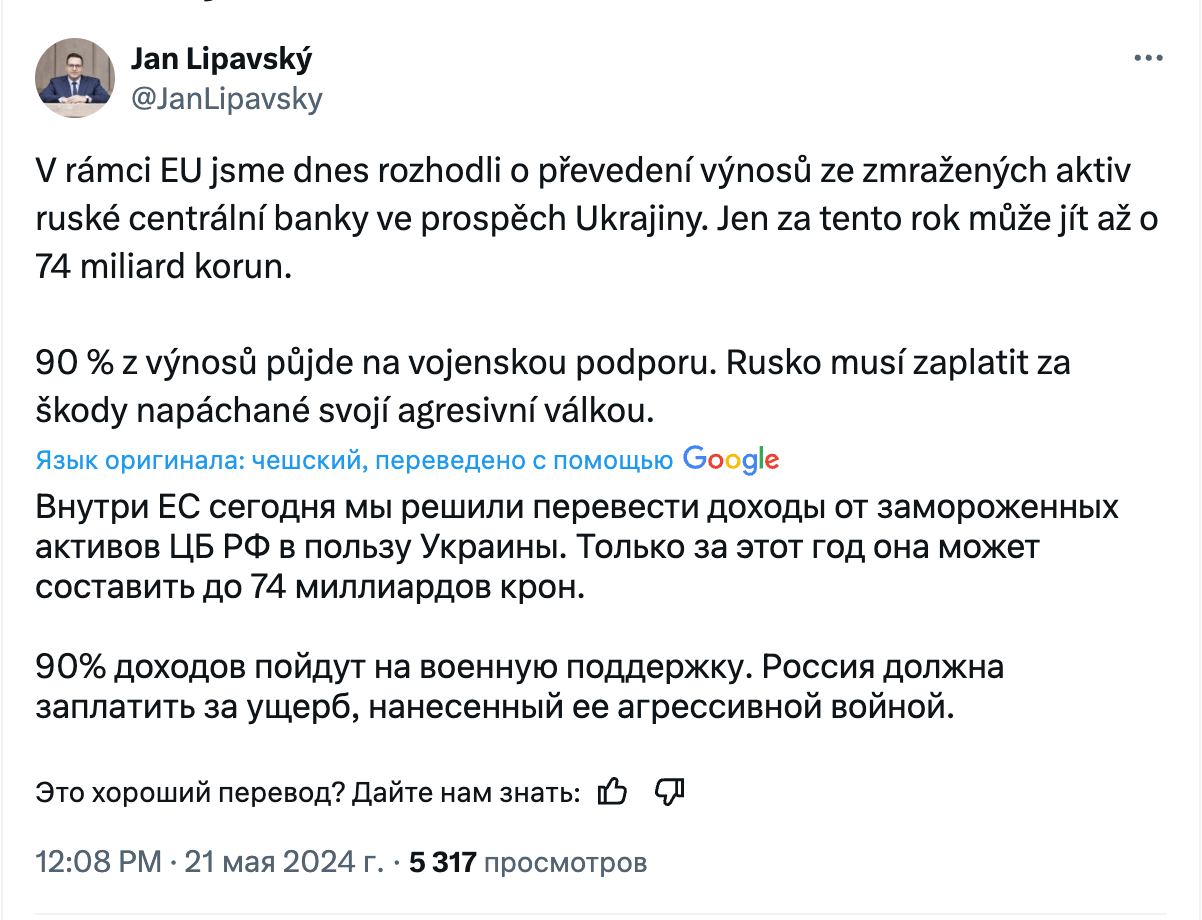 The EU Council has approved the transfer of profits received from frozen Russian assets to Ukraine. This year, the amount may reach €3 billion.