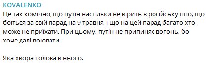 "It's so comical that Putin doesn't believe in Russian air defense so much that he's afraid for his parade on May 9, and that many people may not come to this parade. At the same time, Putin doesn't stop firing because he wants to keep fighting. What a sick head he has," the head of the Central Defense Committee emphasized.