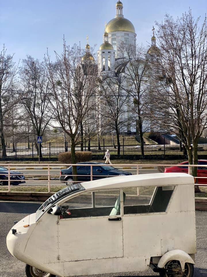 A car with a rather interesting design was recently spotted in Bucha. It had only three wheels and was designed on the basis of an old motor scooter.