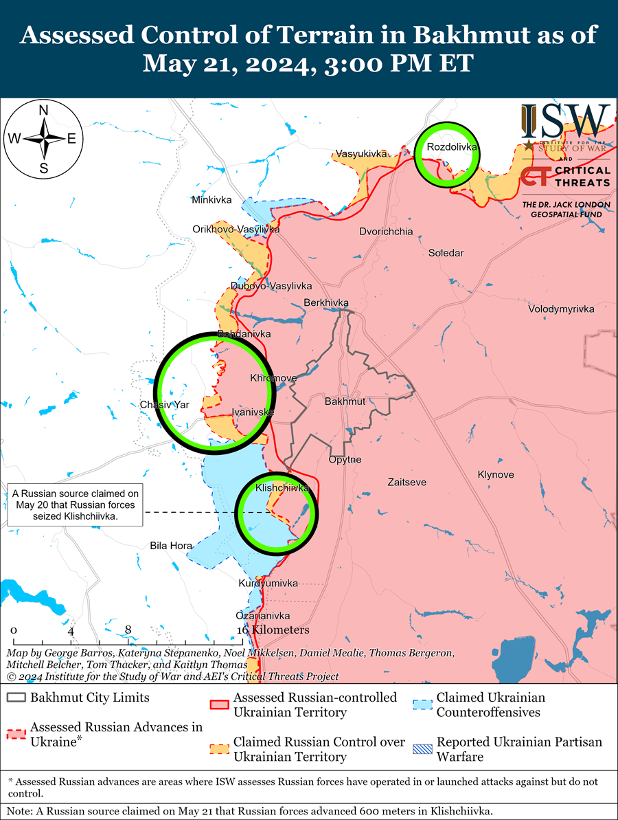 Russian sources claimed that Russian troops had made marginal advances south of Siversk (northeast of Bakhmut), but the ISW did not observe visual evidence to confirm these claims.