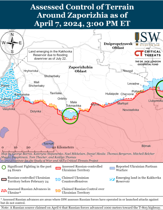 On April 7, positional fighting continued in the western Zaporizhzhia Region near Robotyne and northwest of Verbove (east of Robotyne), but there were no confirmed changes on the front line. A Russian milblogger claimed that Russian forces had captured an unspecified Ukrainian position northwest of Verbove, but ISW found no visual evidence of this.