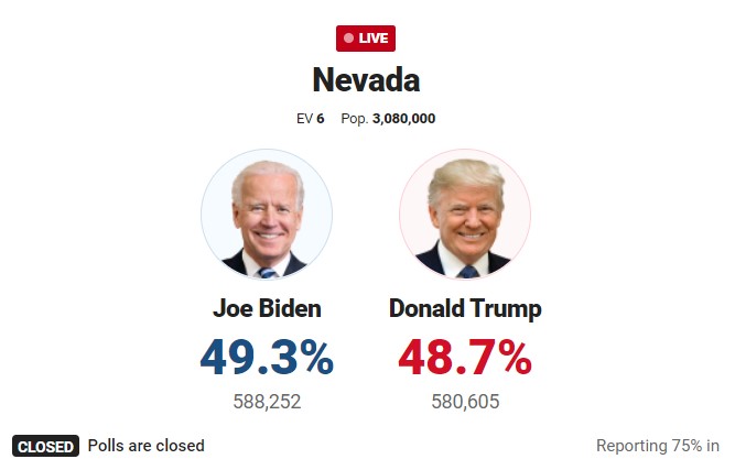 At the moment, 75% of the votes have been counted, with Joe Biden at 49.3% and the incumbent President Donald Trump at 48.7% of the vote.