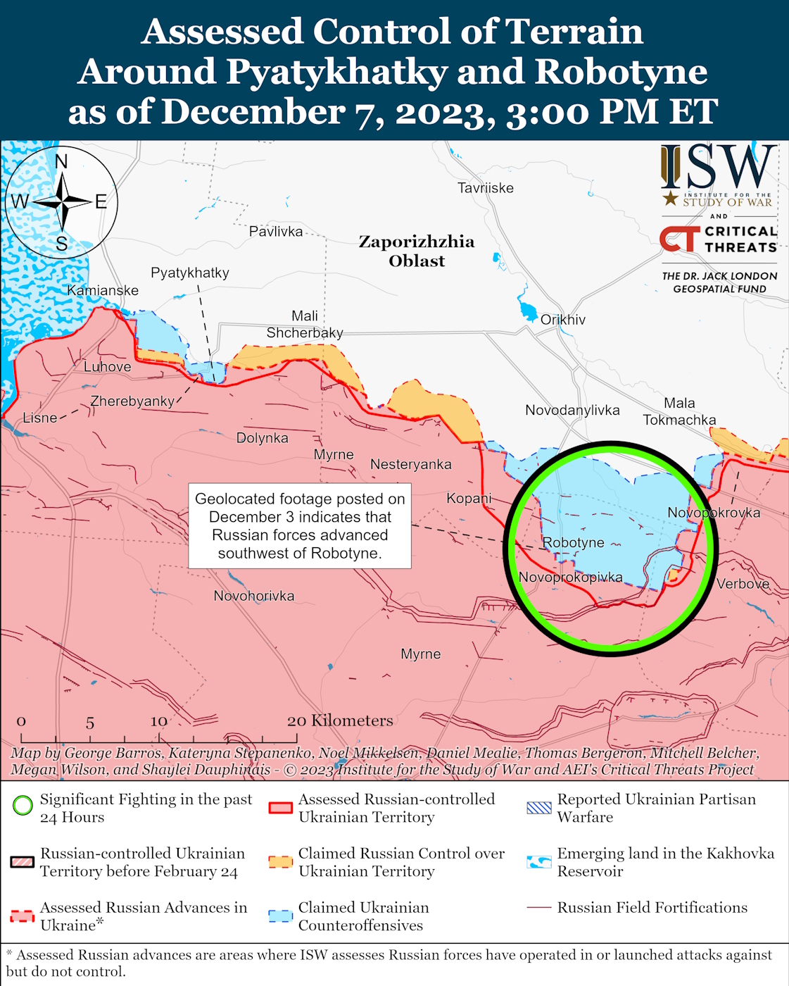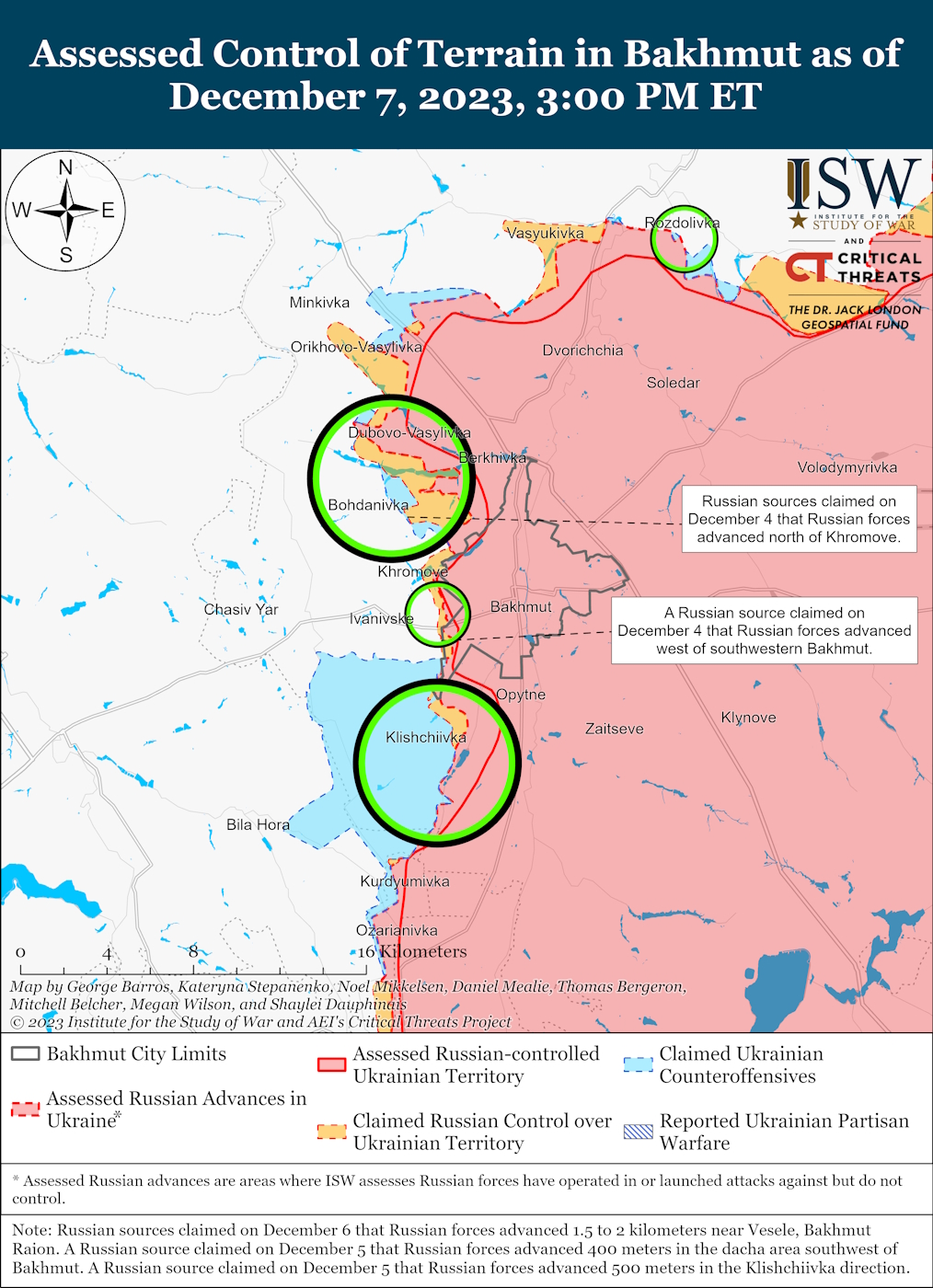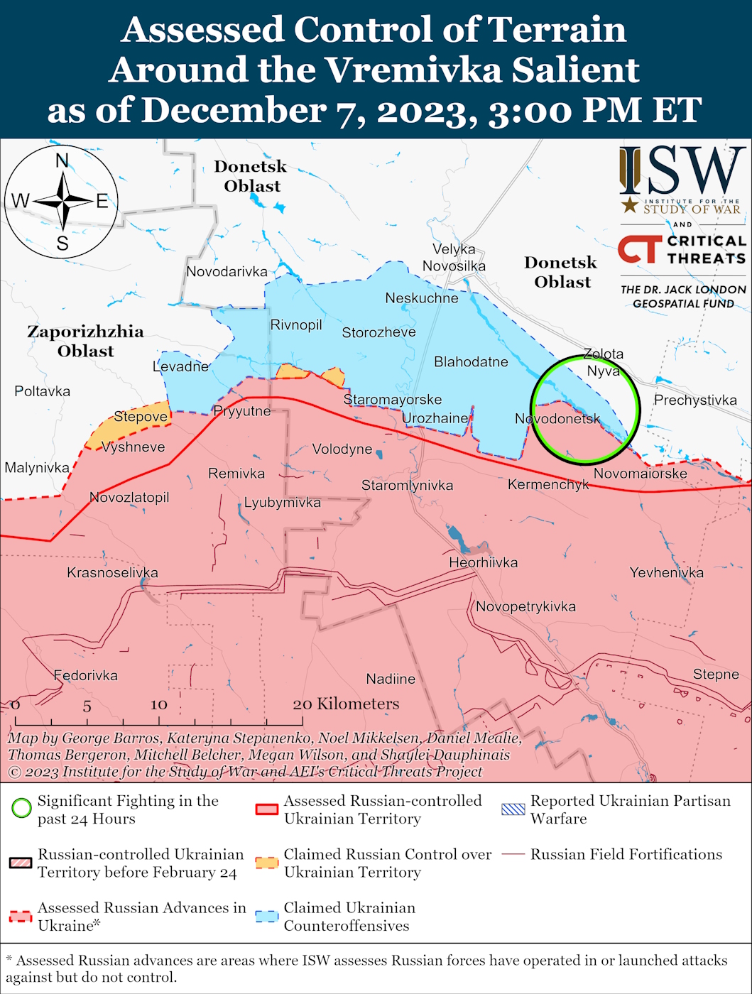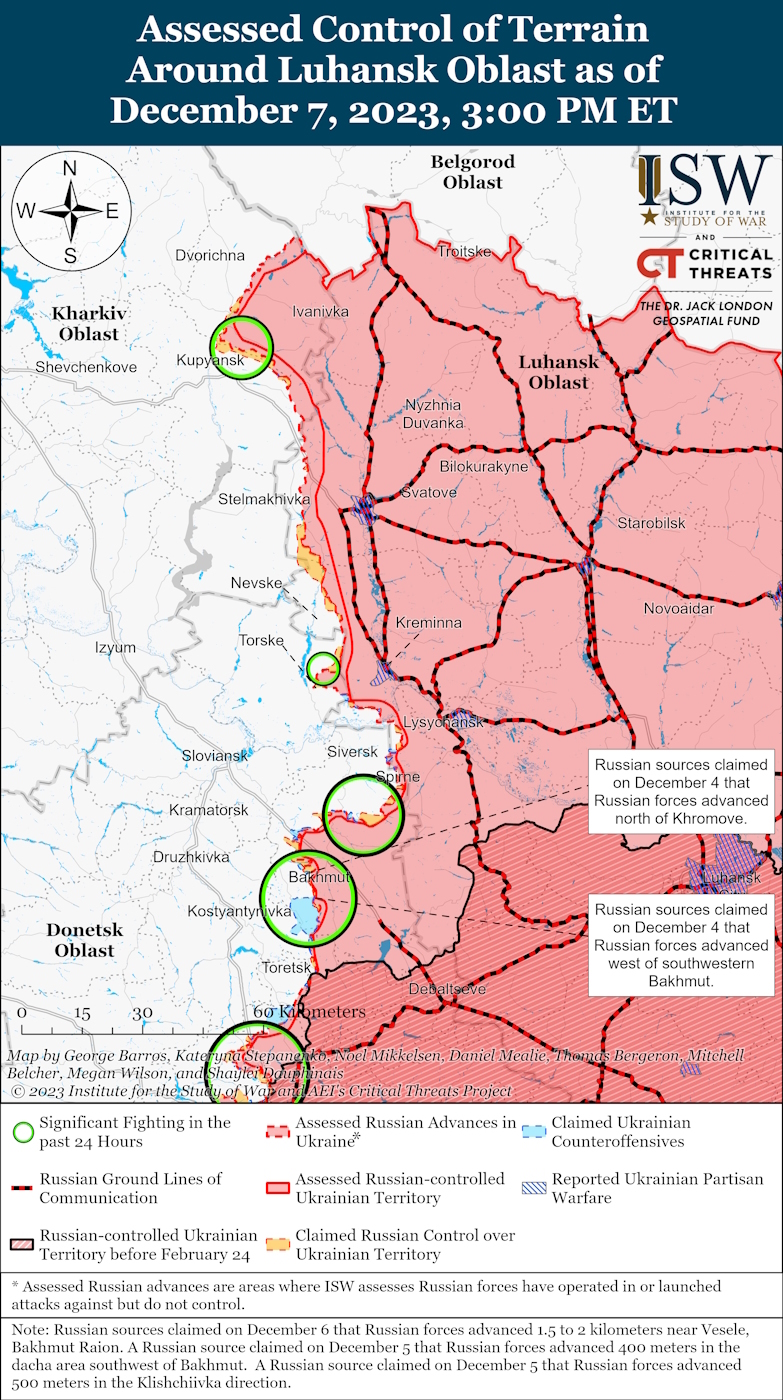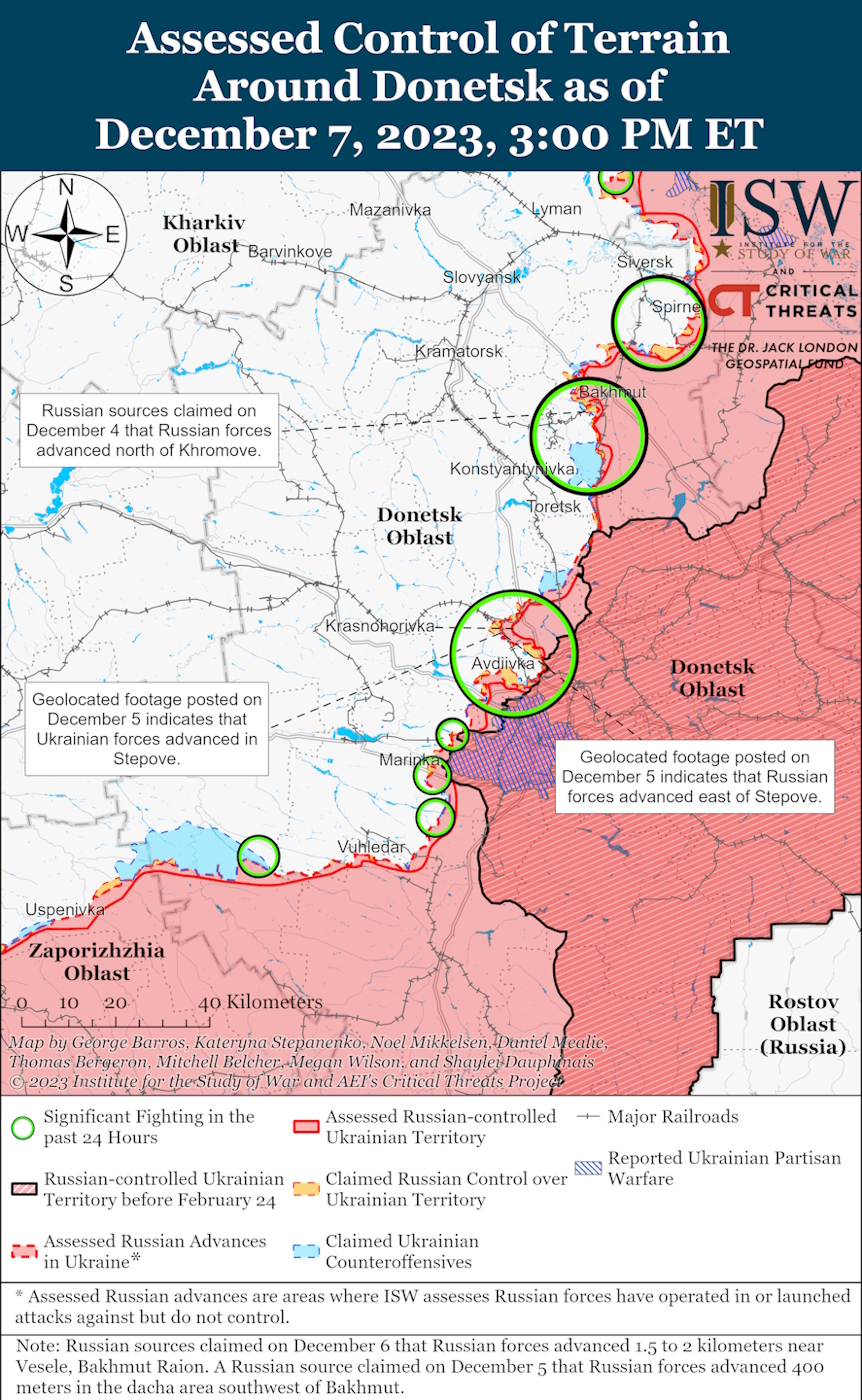 ISW reports that Russian forces conducted offensive operations near Avdiivka on December 7th, making slight advancements to the east of Stepove and southeast of Avdiivka.