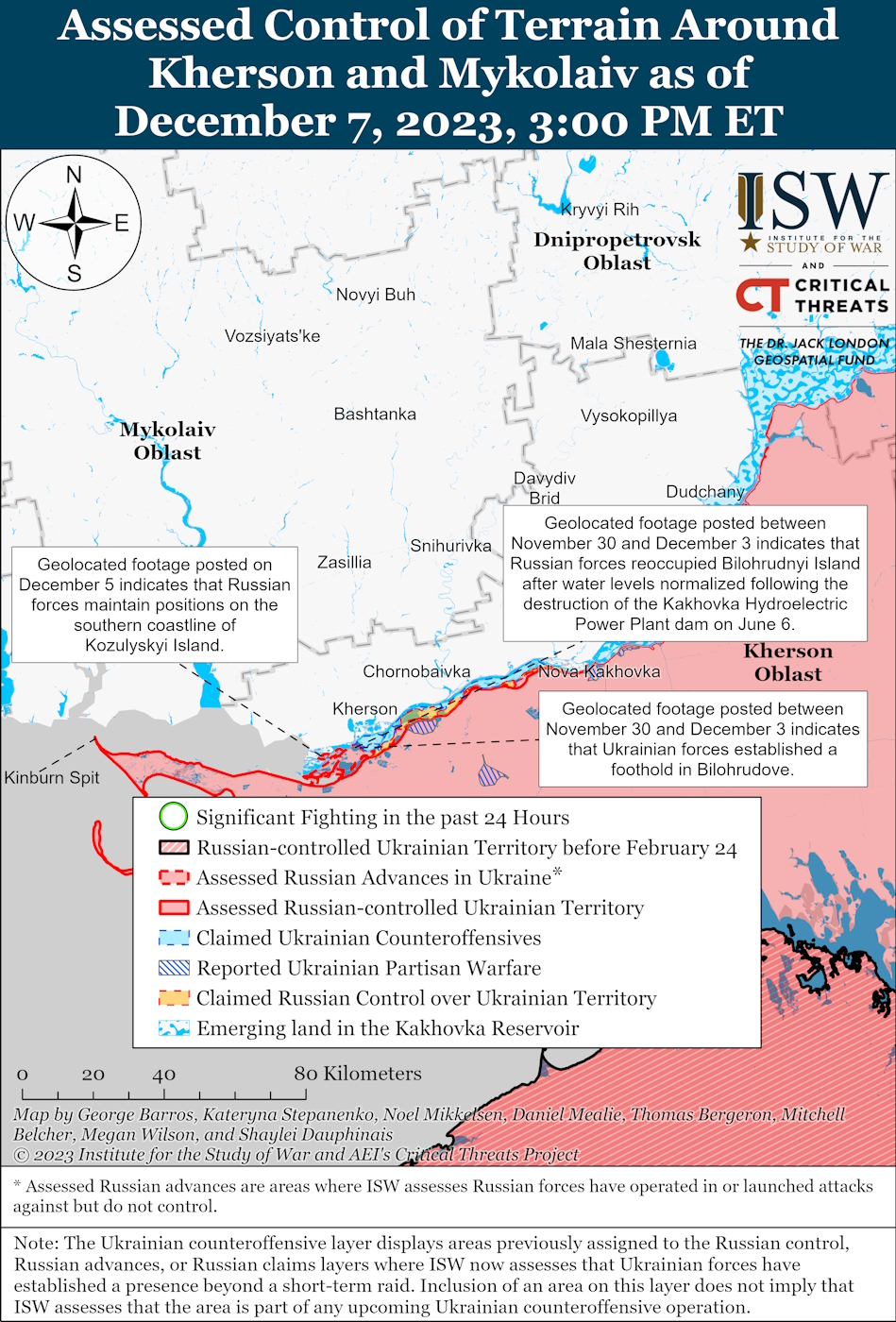 Ukrainian forces maintain positions on the eastern bank of the Dnipro River. Simultaneously, Russian military reduced aviation activity over the Black Sea after a Su-24M bomber was shot down near Snake Island on December 5th.