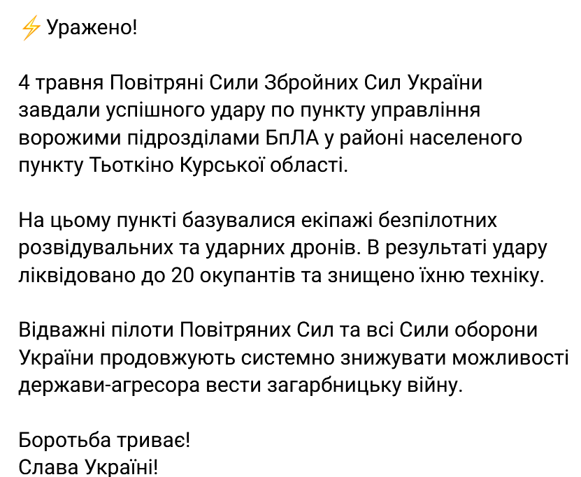 The General Staff of the Armed Forces of Ukraine reported on the successful work of Ukrainian aviation in the Kursk region of the Russian Federation. On May 4, the Air Force launched a devastating attack on the control point of enemy drone units.