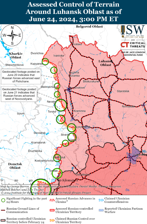 Experts add that Russian troops continued to conduct ground attacks west and southwest of Donetsk on June 24, but with no changes to the frontline. Fighting also continued southwest of Donetsk near Heorhiivka, Paraskoviivka and Kostiantynivka.