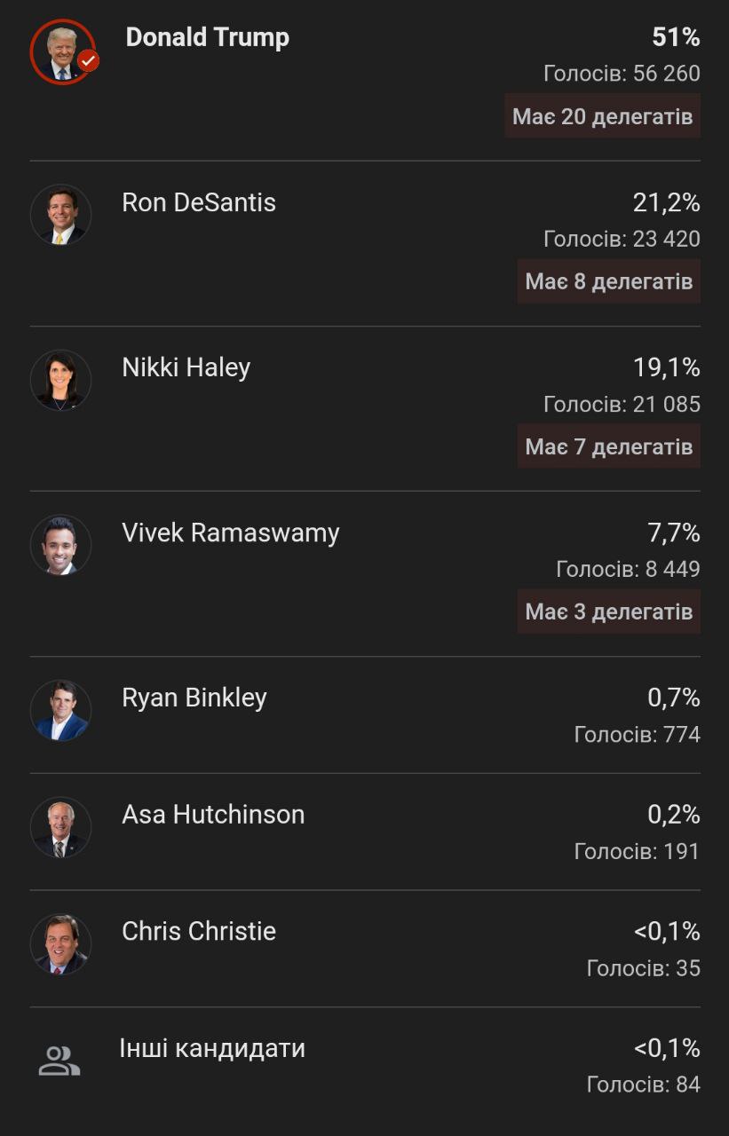 According to Edison Research, after 95% of the votes were counted, Trump received 51% support. Florida Governor Ron DeSantis, 45, has unexpectedly pulled into second place, he has 21%. Former U.S. Ambassador to the United Nations Nikki Haley has 19%. Entrepreneur Vivek Ramaswamy, known for his anti-Ukrainian statements, received less than 8% of the vote and dropped out of the race. He supported the candidacy of Donald Trump.