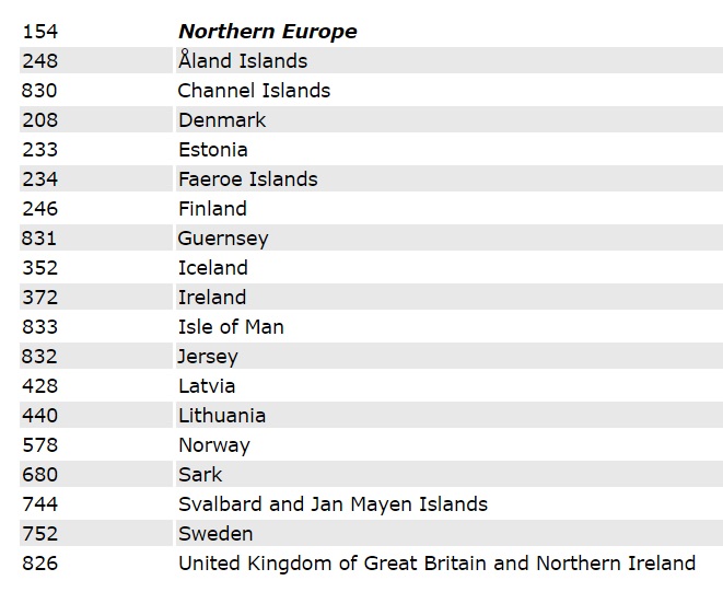 Согласно введенным изменениям, теперь к Северной Европе относятся Исландия, Швеция, Норвегия, Дания, Финляндия, Великобритания, Ирландия, Эстония, Латвия, Литва.