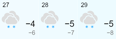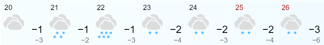 Після святкування католицького Різдва середня температура вдень опуститься до -5 °C. Столицю продовжить засипати снігом аж до четверга, 1 січня.