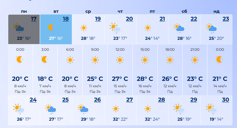 Останній тиждень місяця буде також частково дощовим. Зокрема, опади прогнозують 24-26 червня, а також на вікенд, 29-30 червня, невеликий дощ. Температура вдень досягатиме посеред тижня 32 градусів.