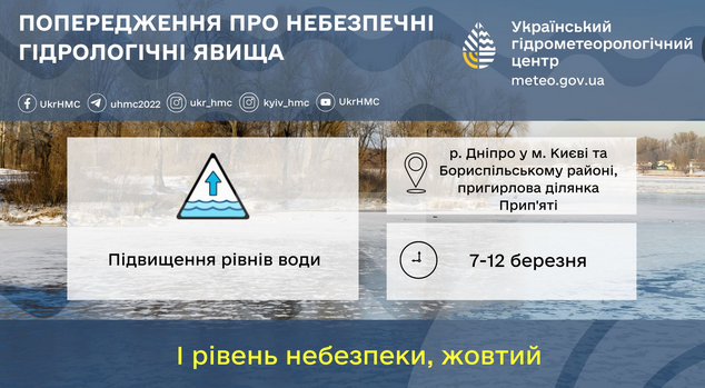Як зазначається, можливі небезпечні гідрологічні явища по Київщині. Зокрема, 7-12 березня на пригирловій ділянці Прип'яті у зоні ЧАЕС рівні води будуть утримуватися на максимальних позначках весняного водопілля зі збереженням води на заплаві в області. Встановлено перший рівень небезпеки - жовтий.
