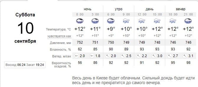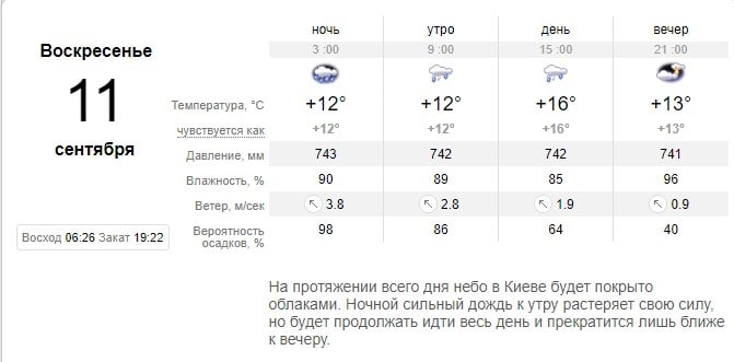 З ранку до вечора в столиці очікуються дощ і прохолодна погода. О шостій ранку буде навіть холодніше, ніж уночі, тому що стовпчик термометра опуститься до +9 градусів. Упродовж дня температура повітря буде на рівні +10+12 градусів.