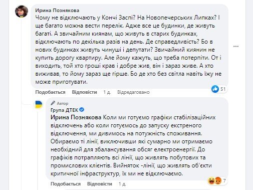 Представник ДТЕК відповів їй, що під час підготовки планів відключень у компанії не дивляться на те, наскільки елітним є район.