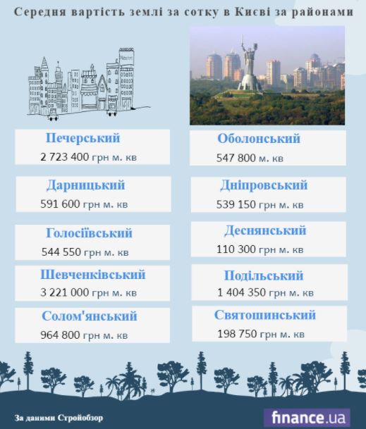 Друге місце займає Печерський район з 2,723 млн гривень за "сотку" землі, а ТОП-3 замикає Подільський - 1,404 млн гривень.