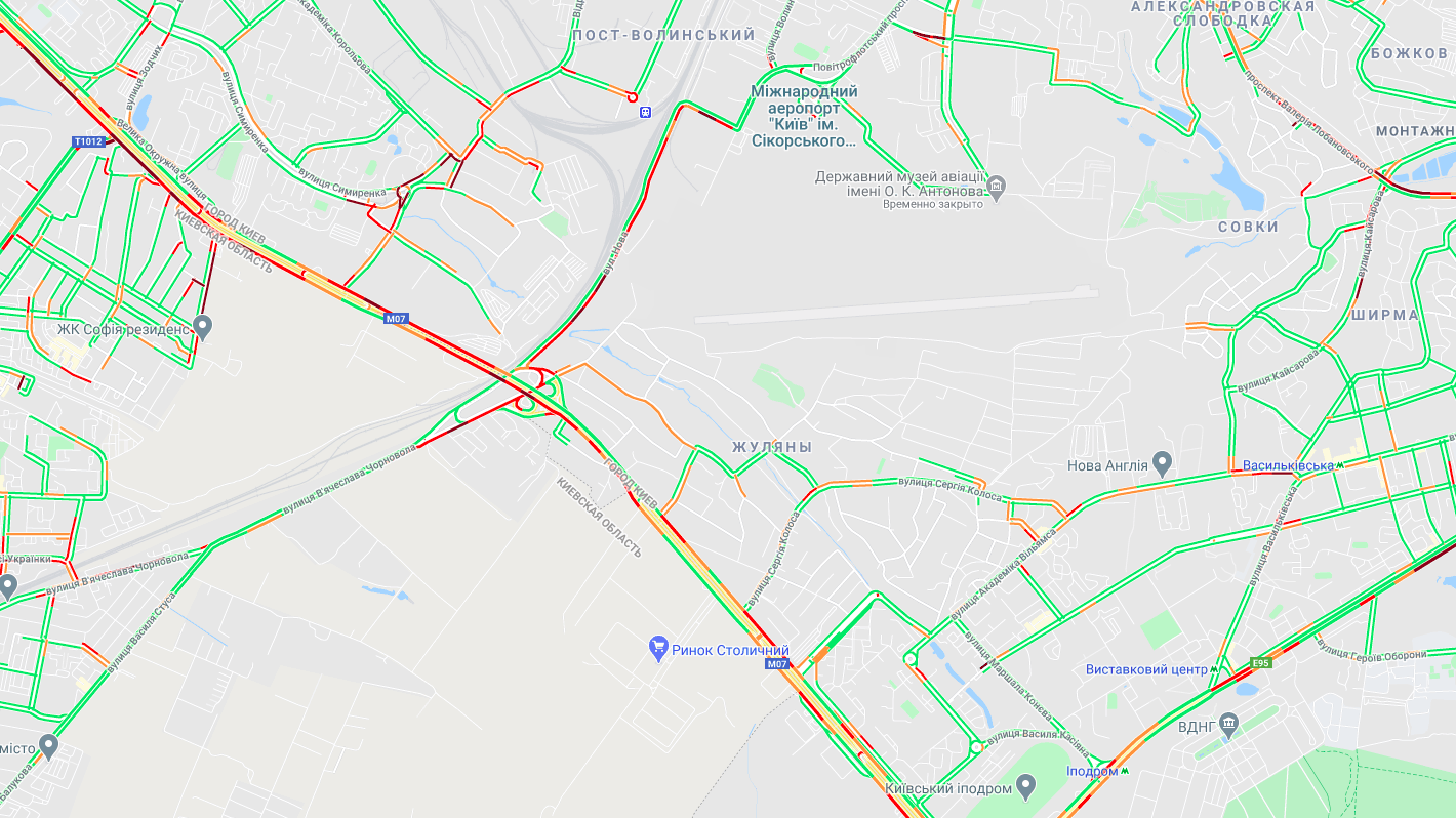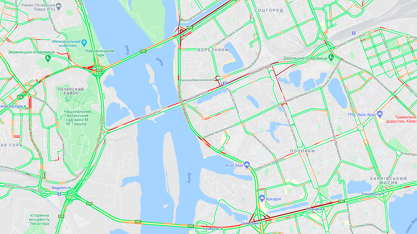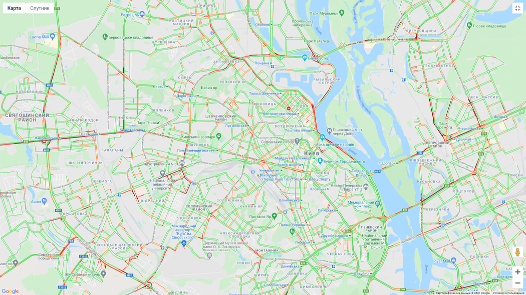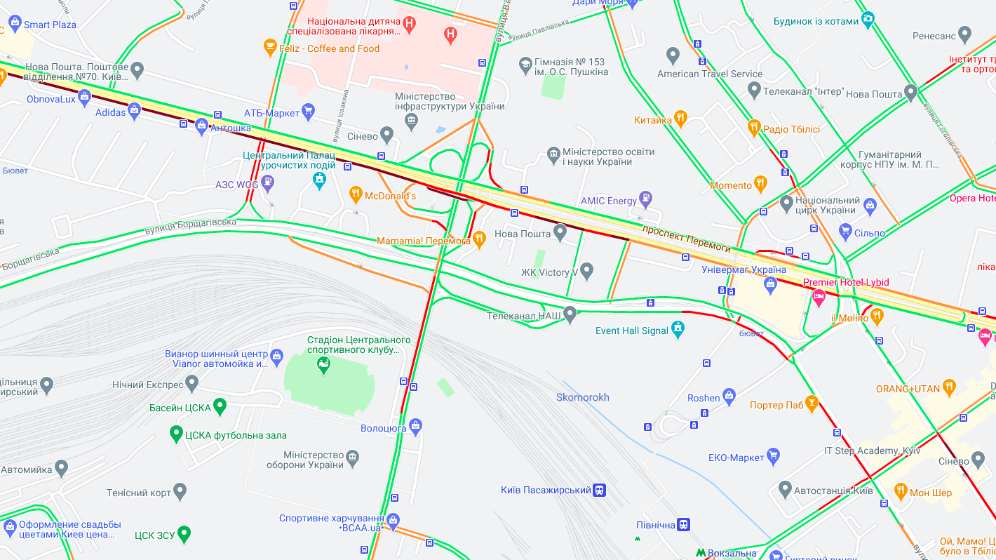 Рух транспорту особливо ускладнено на проспекті Перемоги і вулиці Борщагівській, стоять автомобілі на вулицях Миколи Голеги. Затор виник також на Великій Кільцевій дорозі, Набережне шосе стоїть в пробці в двох напрямках.