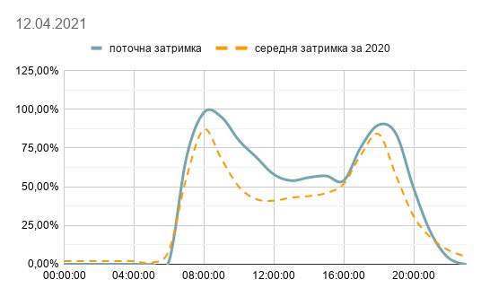 Ситуація вчора, в понеділок, була набагато краще, ніж в понеділок минулого тижня: 42% середньодобової затримки за минулу добу проти 58% тоді. Це означає, що кияни витрачали 0 год 59,4 хв в середньому на поїздку в "годину піку" вчора і 1 ч 09,3 хв раніше.