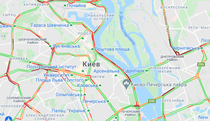 Великий затор утворився біля станції метро "Лук'янівська". Авто стоять у пробках на проспекті Перемоги та вул. Жилянська. Затори утворили на Набережно-Хрещатицькій. Великий затор спостерігається на Набережному шосе.