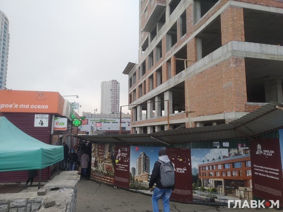 У Києві біля станції метрополітену "Оболонь" будують багатоповерхівку, яка перекриває вхід в метро, жителі обурені такою ситуацією.