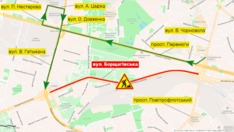 З 21:00 13 серпня до 15:00 17 серпня комунальники виконуватимуть фінальне асфальтування на ділянці від просп. Повітрофлотського до Індустріального шляхопроводу. Під час робіт рух на частині вулиці Борщагівська буде перекрито.
