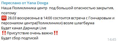 Небайдужа громадянка Яна Довга у своєму Telegram додала, що у неділю, 28 березня, має відбутися зустріч з депутатом Київської міськради Володимиром Гончаровим та персоналом центру, під час якої буде збір підписів.