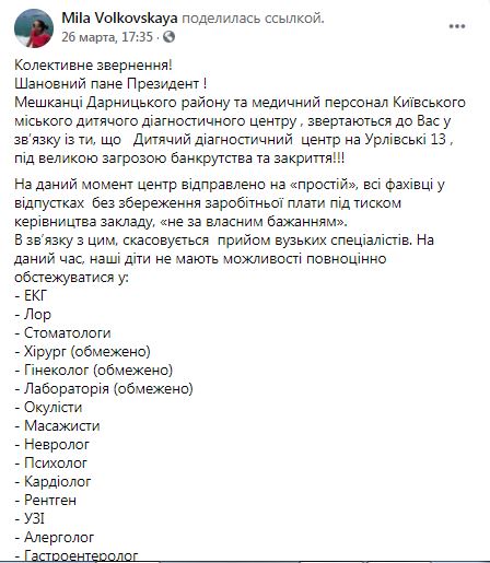 "На даний момент центр відправлено на "простій", всі фахівці у відпустках без збереження заробітньої плати під тиском керівництва закладу, "не за власним бажанням". В зв"язку з цим, скасовується прийом вузьких спеціалістів", - зазначає автор звернення та додає, що наразі діти не мають можливості повноцінно обстежуватися у таких спеціалістів, як хірург, гінеколог, окуліст, масажист, невролог, психолог, кардіолог, стоматолог и т.п.