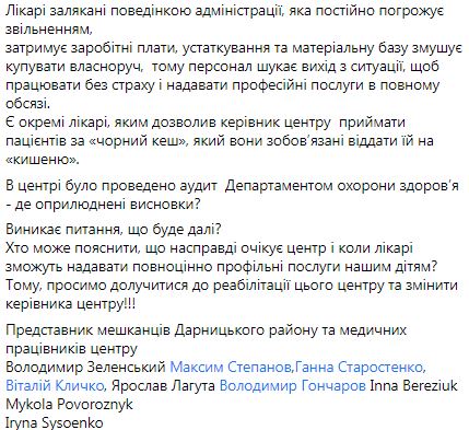 "В центрі було проведено аудит Департаментом охорони здоров"я - де оприлюднені висновки? Виникає питання, що буде далі? Хто може пояснити, що насправді очікує центр і коли лікарі зможуть надавати повноцінно профільні послуги нашим дітям? Тому, просимо долучитися до реабілітації цього центру та змінити керівника центру!", - йдеться у зверненні.