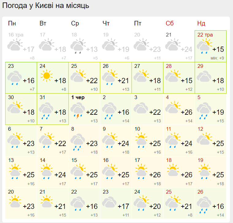 В інші дні погода буде сонячною зі змінною хмарністю, але опади все одно очікуються в такі дні: 6-7, 9-11, 13-17, 19, 24-25 червня. При цьому температура повітря стартуватиме від 20 градусів і в найтепліші дні досягатиме 26 градусів.