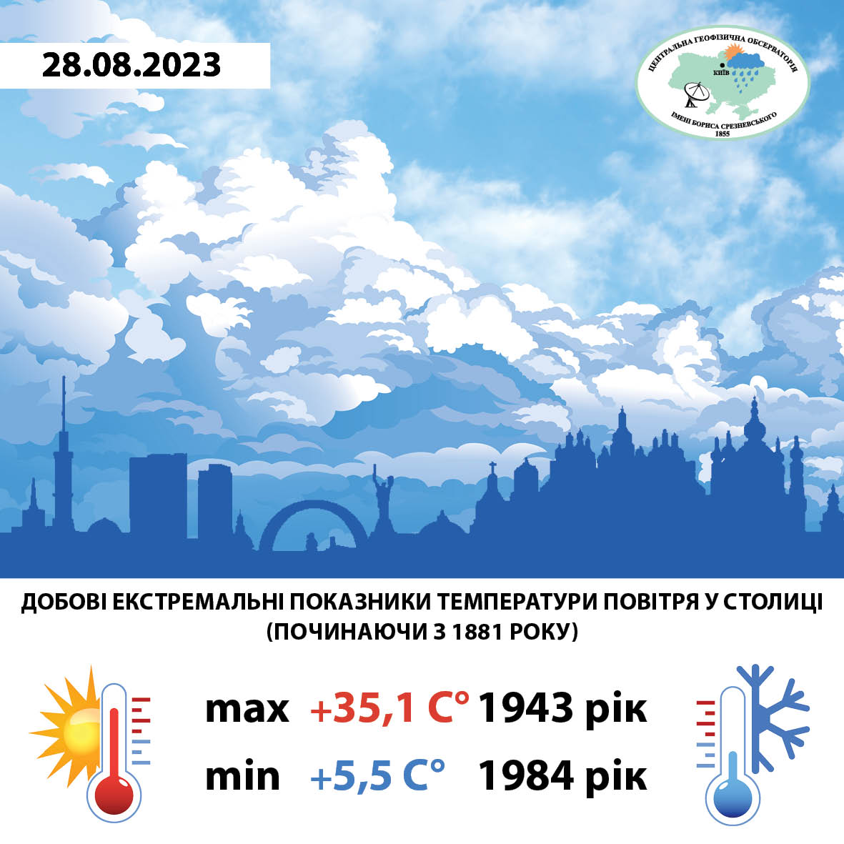 Нагадаємо, що в Києві 27 серпня метеорологи констатували аномальну спеку і зафіксували три температурні рекорди. Ніч виявилася найтеплішою, вдень стовпчики термометрів досягли рекордних значень, а середньодобова температура склала +26,9 ° С і також виявилася рекордною за весь час спостережень.