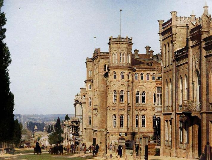 Будівля на фото виглядає як справжній замок! А вдалині видно Залізний храм, який колись стояв на Галицькій площі.
