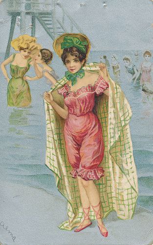 У той час чоловіки для купання вдягали трико, яке складалося з довгих трусів і майки, які були зшиті разом. Щодо жінок, вони носили суцільні купальники з однотонної тканини. Також обов'язковим елементом були шапочки, капелюхи або пов'язки для волосся, які використовувалися під час купання.