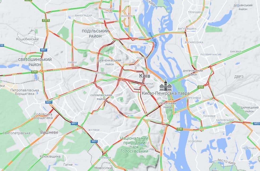 Довгі звтори утворилися на вулицях Саперно-Слобідській, Джона Маккейна, Великій Васильківській, Льва Толстого. Автомобілі стоять і на Залізничному шосе, бульварі Дружби Народів, бульварі Лесі Українки, бульварі Тараса Шевченка. Майже паралізувано рух на Хрещатику, Володимирській, Ярославовому Валу. Рух утруднений біля багатьох станцій метро, що знаходяться в центрі.