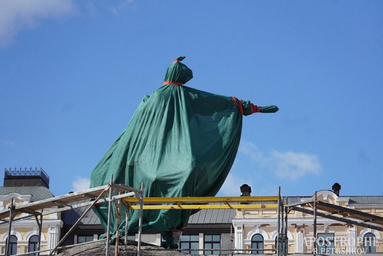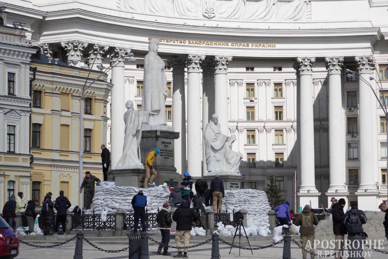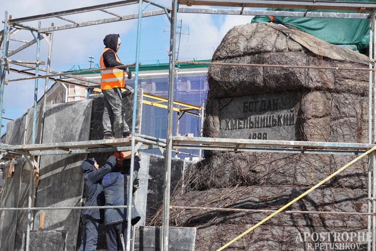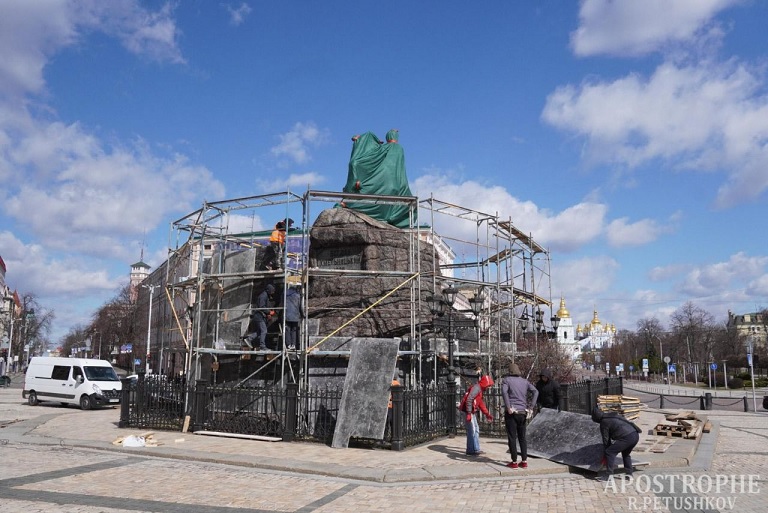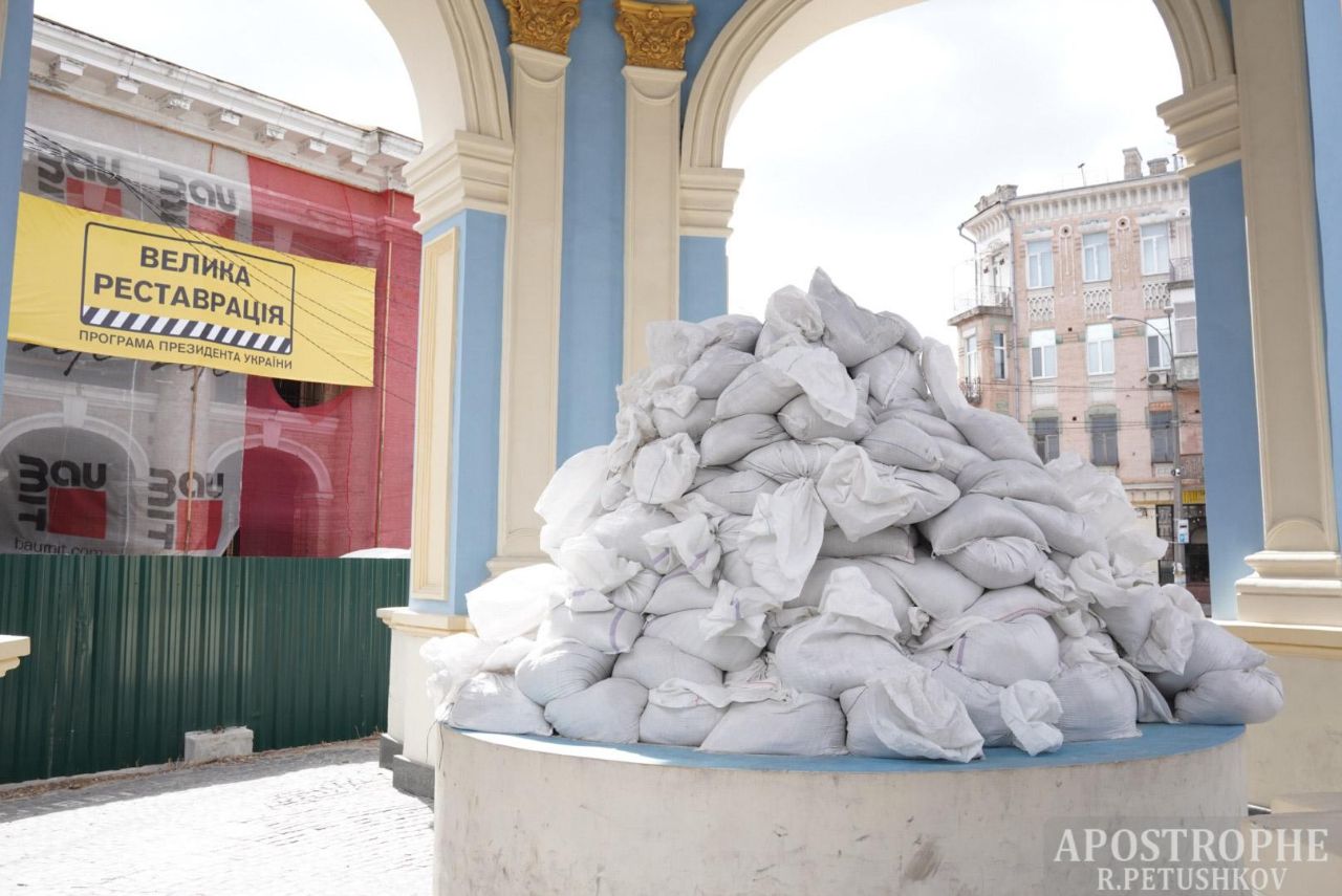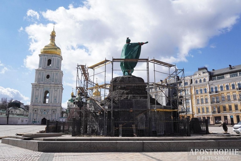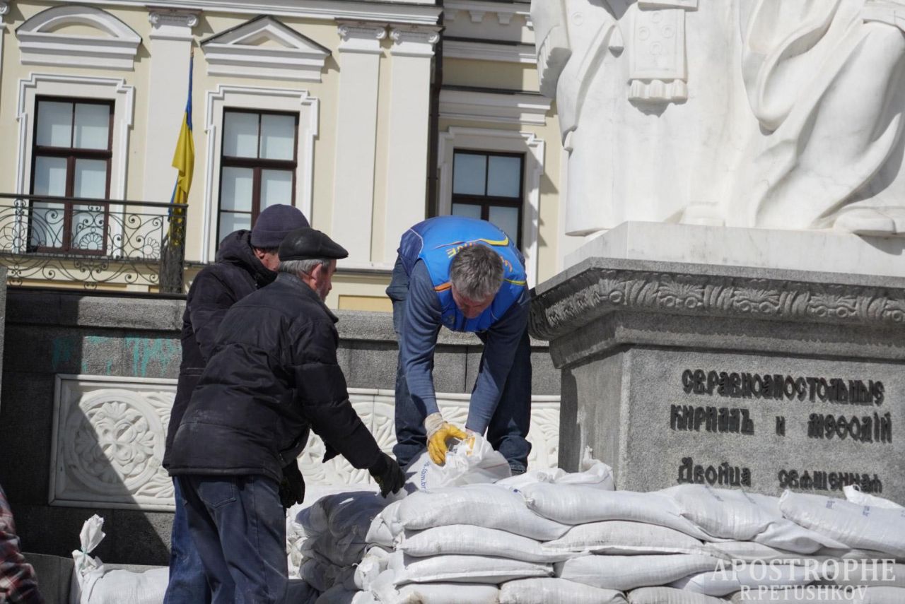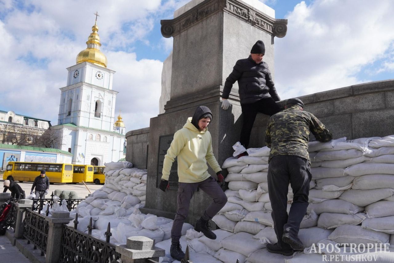 На кадрах із Софійської площі видно, що навколо пам'ятника гетьману Богдану Хмельницькому збудовано будівельні риштування, а сам пам'ятник обтягнутий зеленою тканиною. Містяни будують захисні конструкції, щоб уберегти цінне архітектурне та культурне надбання від влучення можливих осколків ракет, снарядів та інших боєприпасів окупантів.