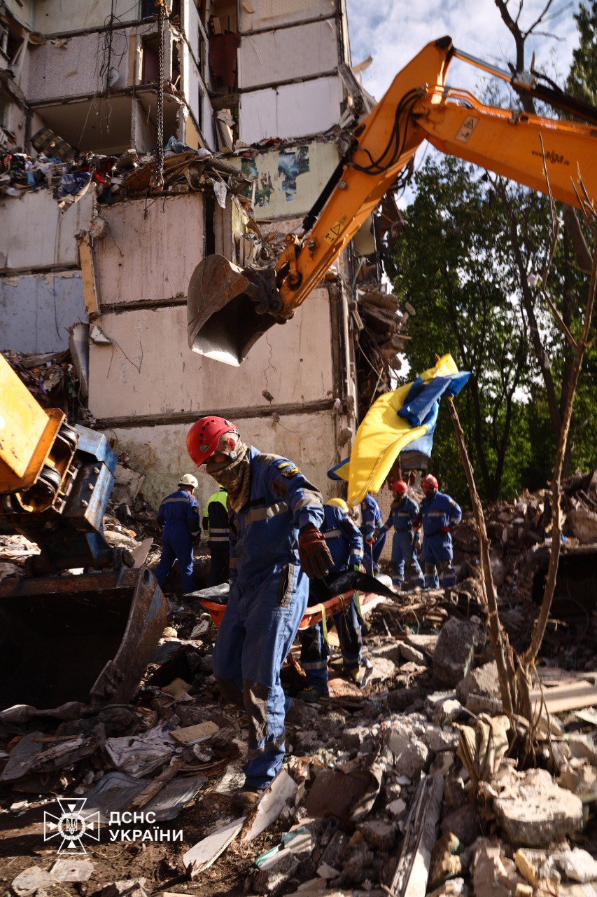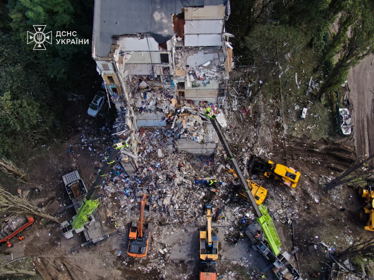 На місці російської удару в Святошинському районі триває розбір завалів працівниками ДСНС.